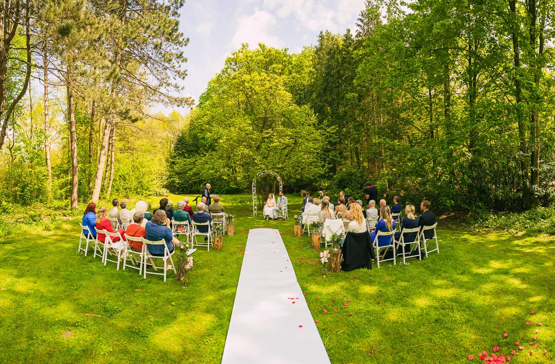 Aan het eind van een prachtige veld, stonden stoelen tafels en een sierboog klaar voor het bruidspaar.